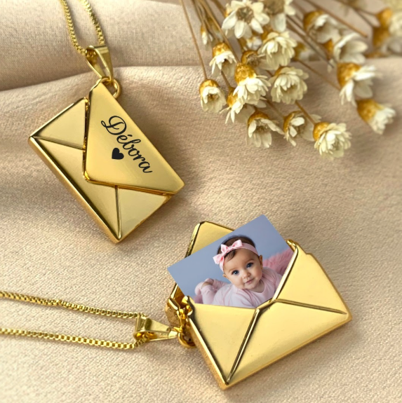 Relicário exclusivo da coleção Memórias, banhado a ouro 18k, em elegante formato de envelope. Personalizado com gravação a laser que eterniza o nome que você escolher, ele se abre para revelar um espaço delicado, perfeito para guardar aquela foto que carrega um pedaço do seu coração. Uma joia única que combina sofisticação e sentimento, feita para guardar suas melhores lembranças sempre por perto
